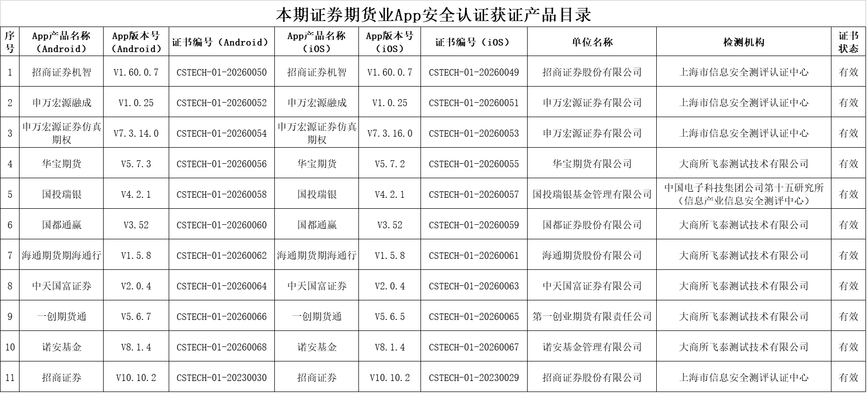 招商證券股份有限公司的“招商證券機智”App等10款App通過證券期貨業App安全認證,符合行業標準《證券期貨業移動互聯網應用程序安全規范》(JR/T 0192-2020)及《證券期貨業移動互聯網應用程序安全檢測規范》(JR/T 0240-2021)要求,獲得認證證書。