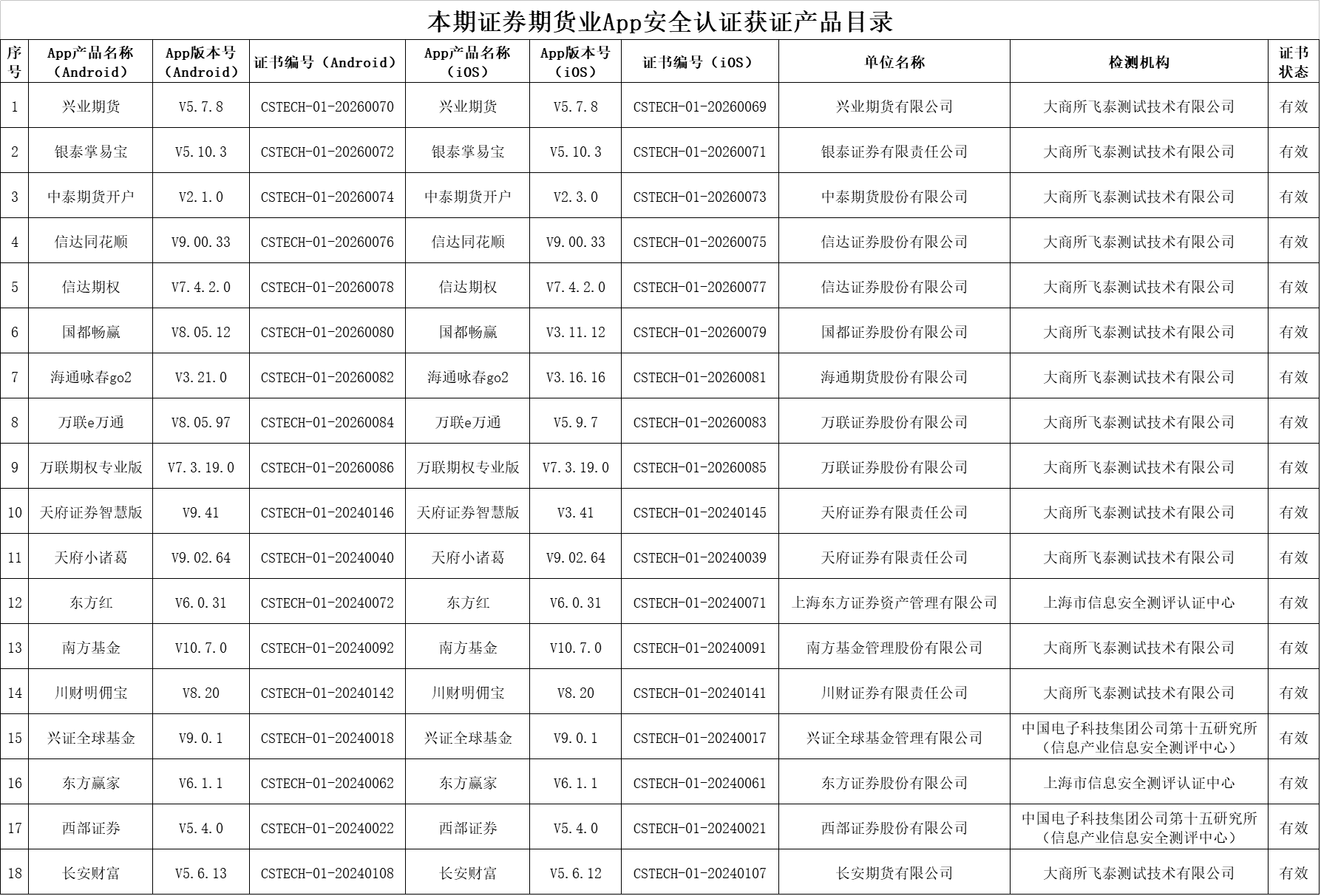 興業期貨有限公司的“興業期貨”App等9款App通過證券期貨業App安全認證,符合行業標準《證券期貨業移動互聯網應用程序安全規范》(JR/T 0192-2020)及《證券期貨業移動互聯網應用程序安全檢測規范》(JR/T 0240-2021)要求,獲得認證證書。
